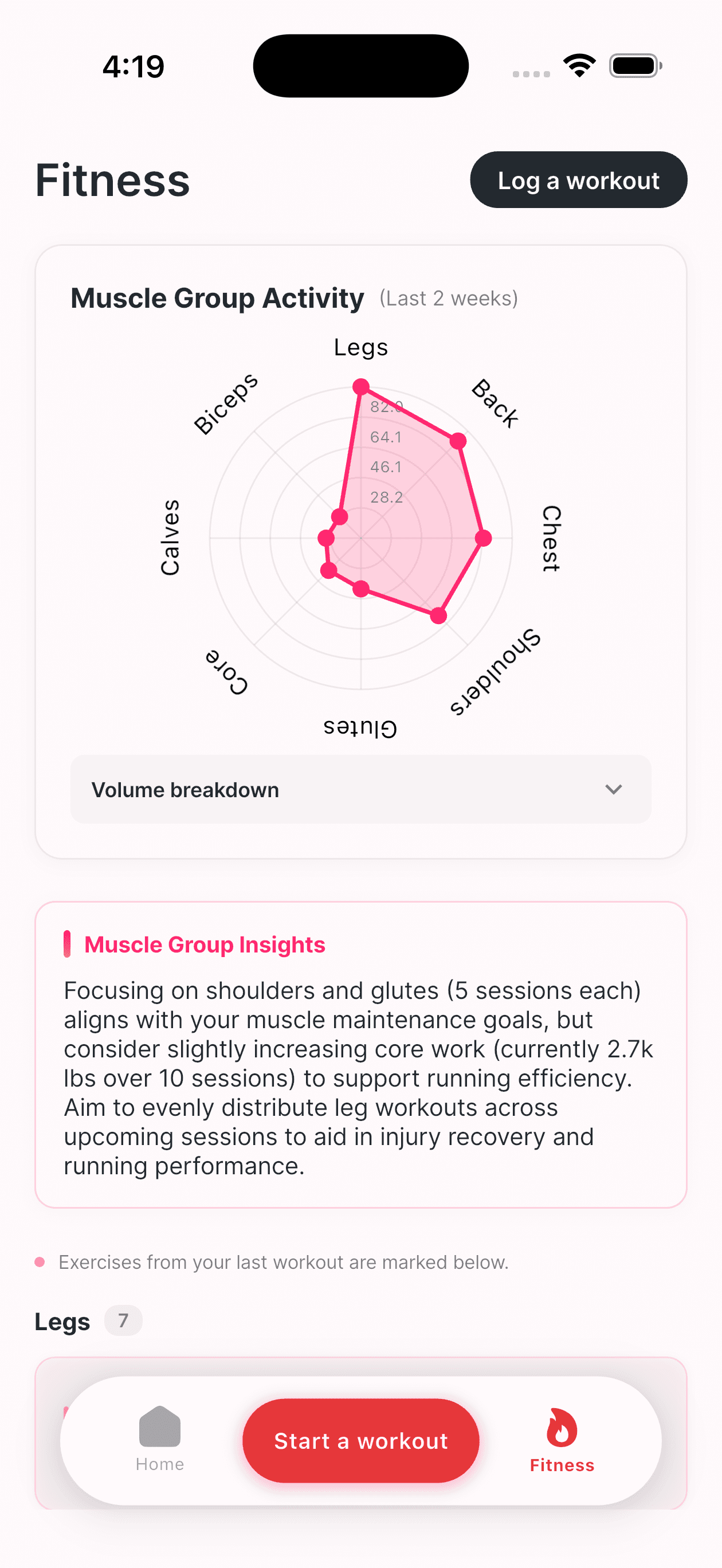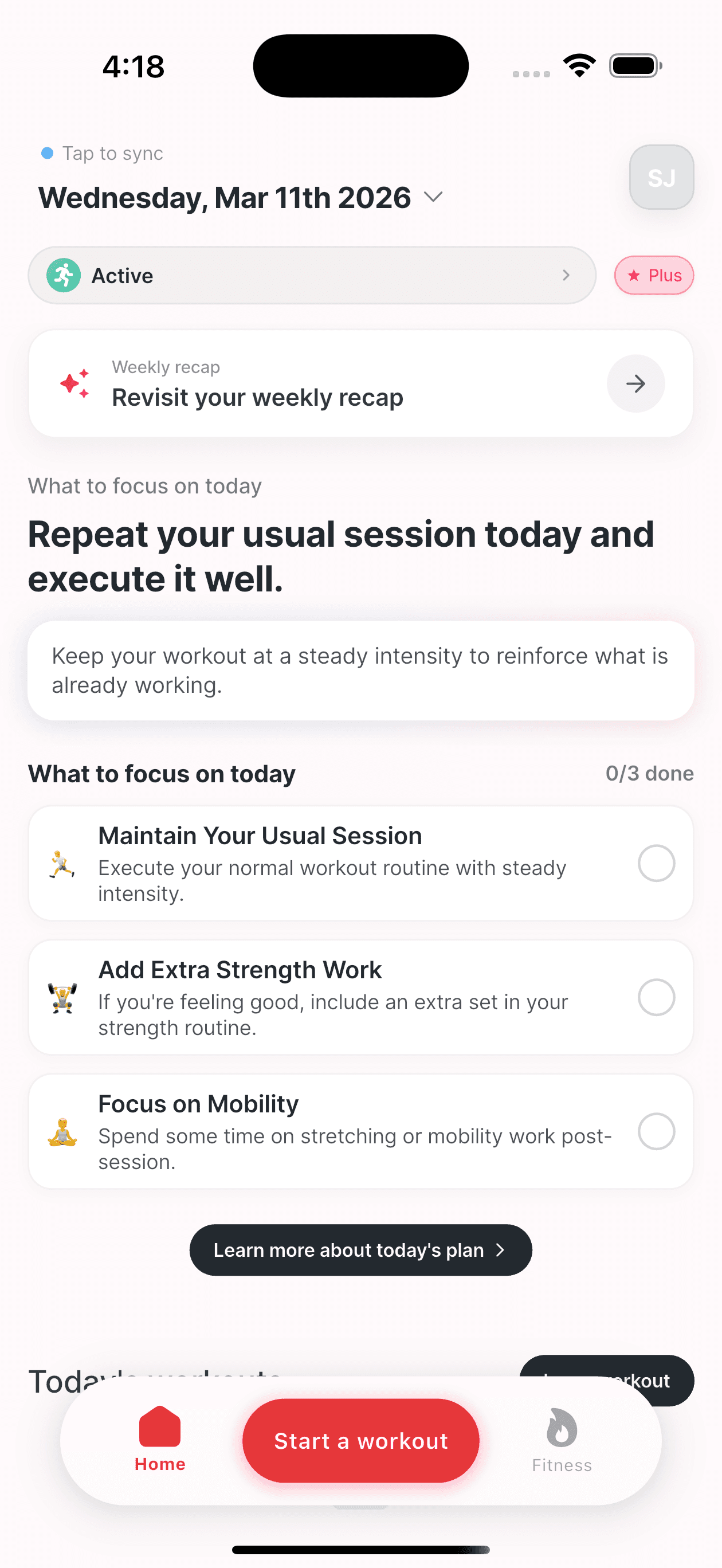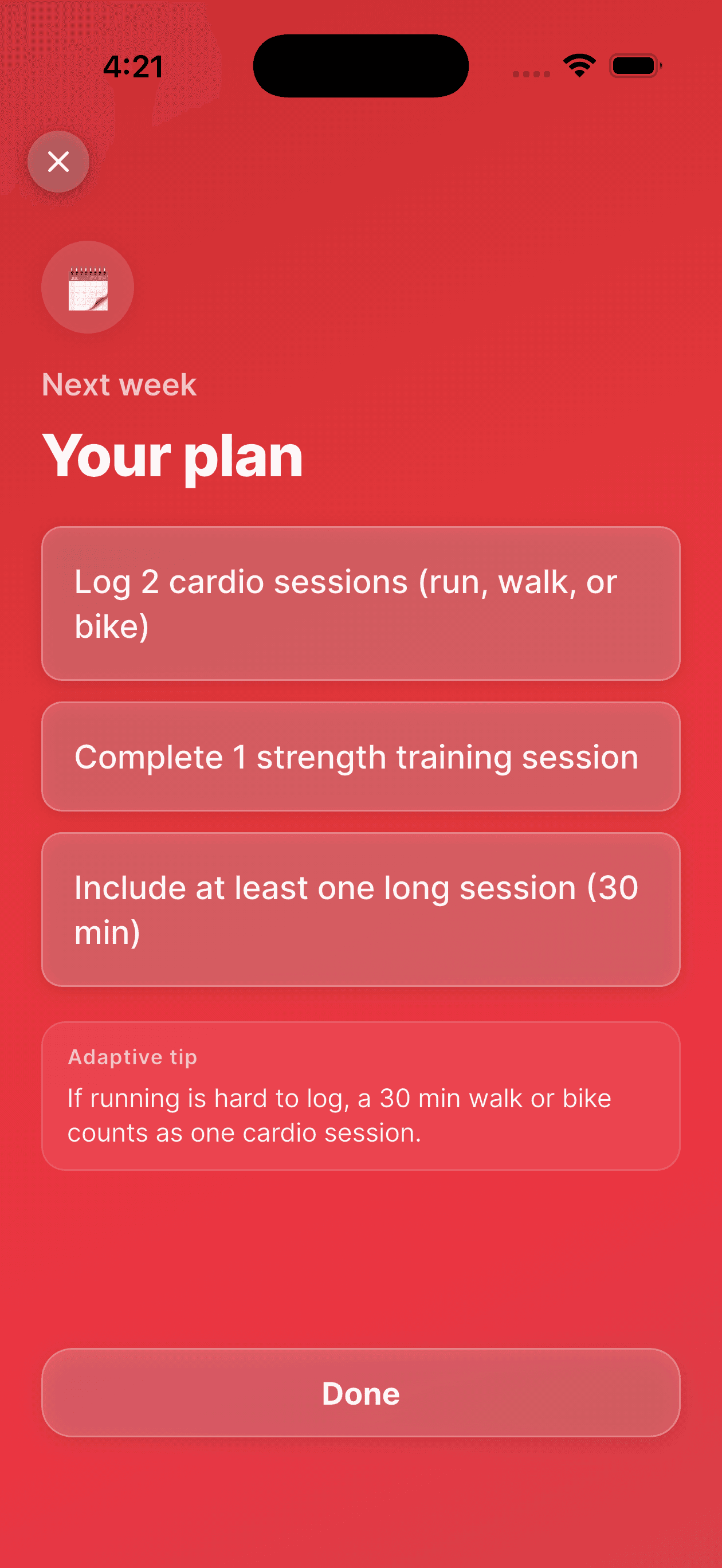 Your workouts adapt based on your goals, workout history, energy levels, sleep, and recovery trends - whether from a fitness tracker or daily check-ins. This helps deliver training recommendations that match your progress, preferences, and physical limitations.